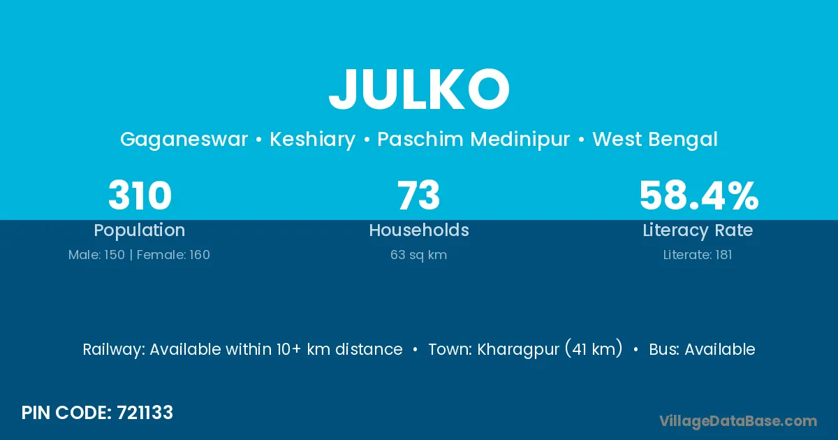 Kharagpur (41 km) is the nearest town to Julko village for major economic activities and is located approximately 41 km away.