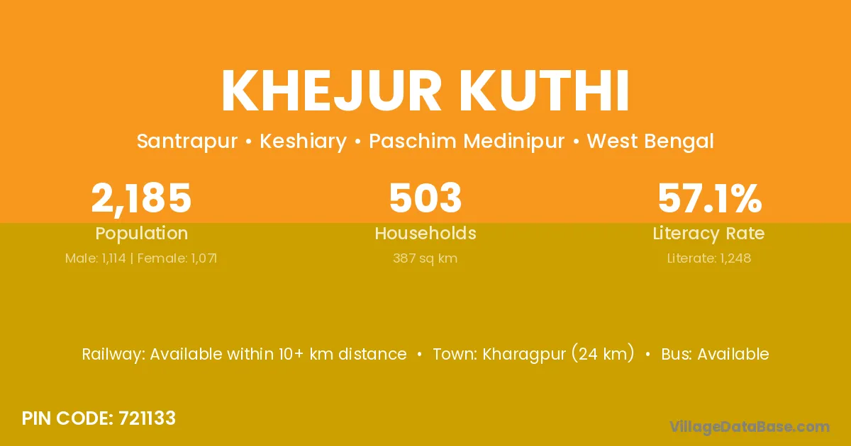 Kharagpur (24 km) is the nearest town to Khejur Kuthi village for major economic activities and is located approximately 24 km away.