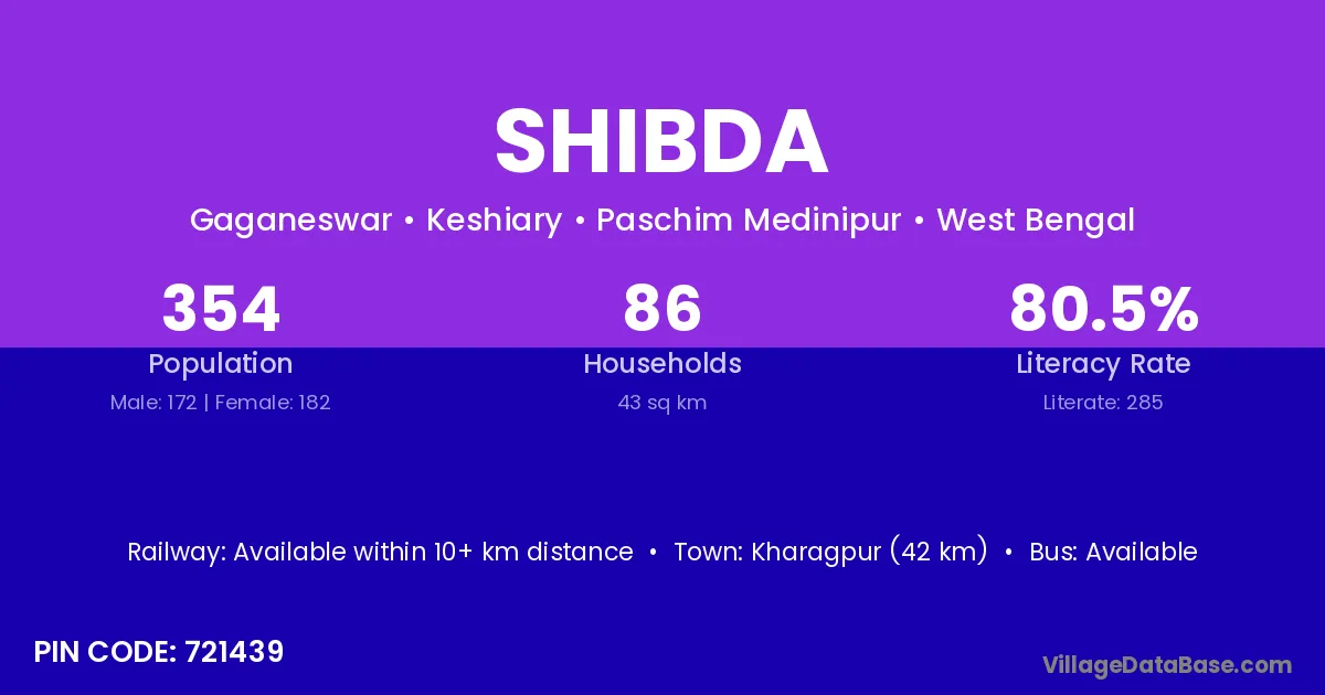 According to Census 2011 information, the village code of Shibda village is 721439.