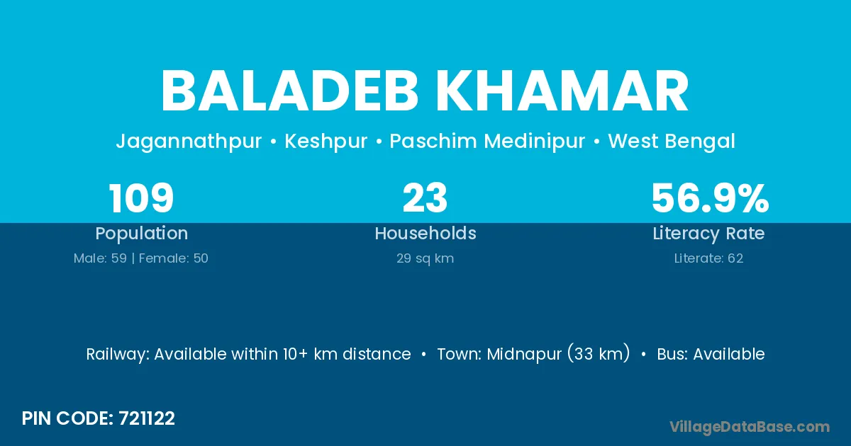 Midnapur (33 km) is the nearest town to Baladeb Khamar village for major economic activities and is located approximately 33 km away.