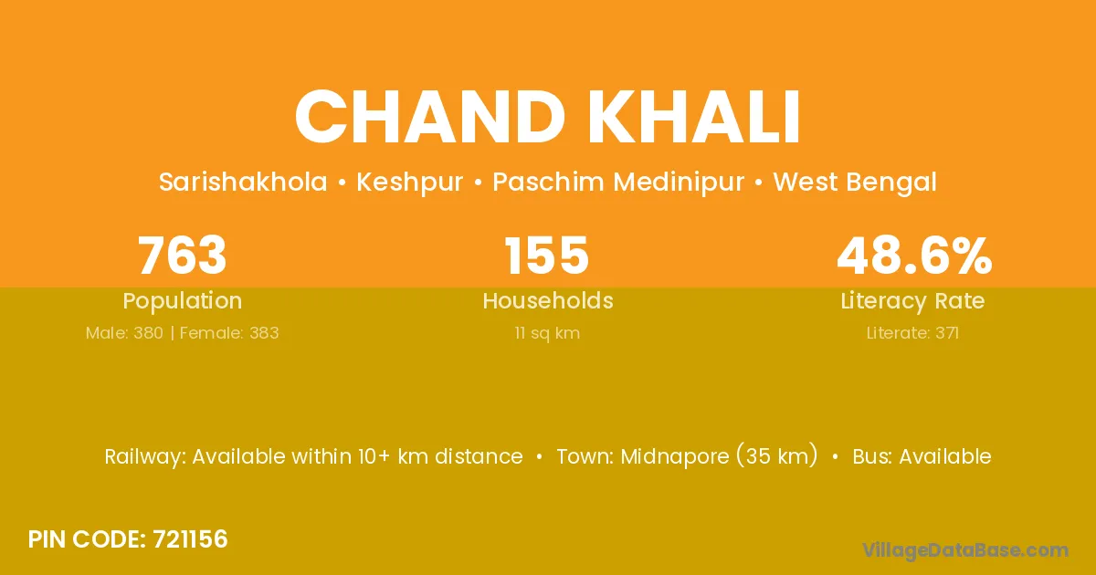 Midnapore (35 km) is the nearest town to Chand Khali village for major economic activities and is located approximately 35 km away.