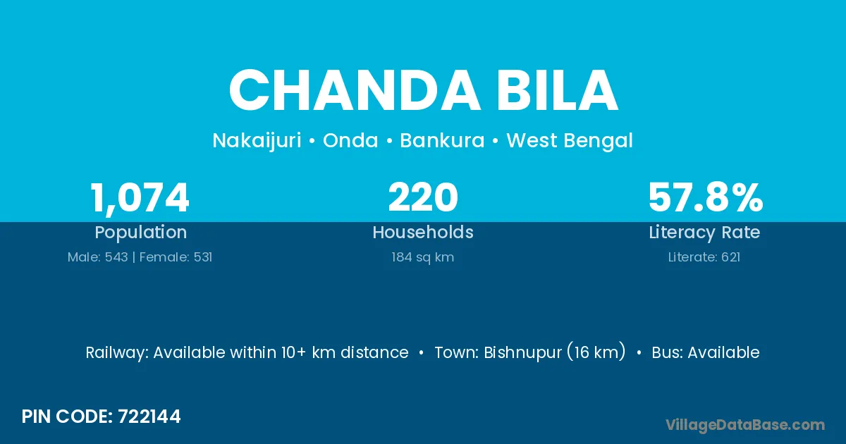 Midnapur (10 km) is the nearest town to Chanda Bila village for major economic activities and is located approximately 10 km away.