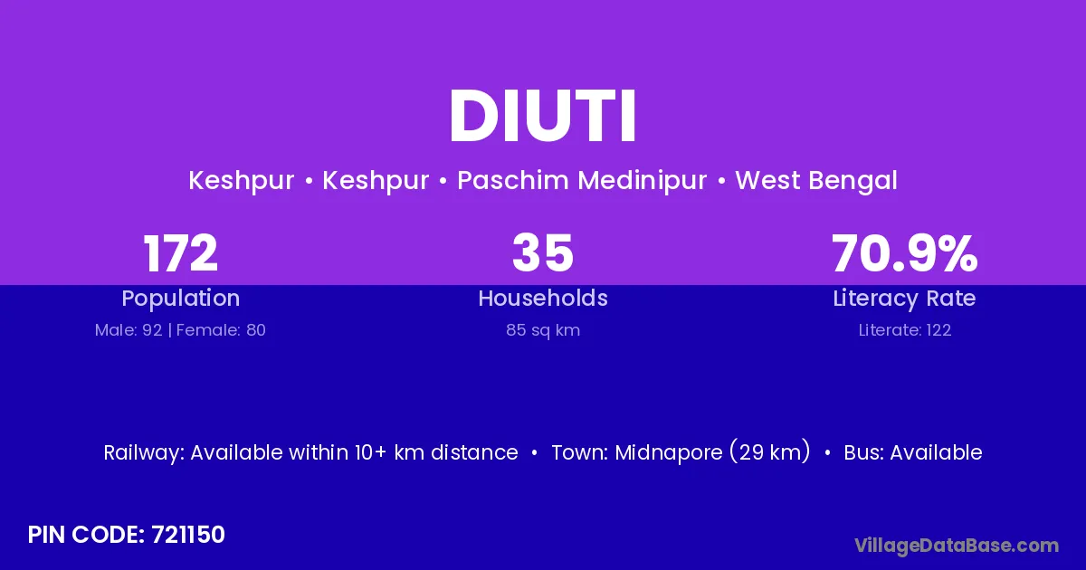 Midnapore (29 km) is the nearest town to Diuti village for major economic activities and is located approximately 29 km away.