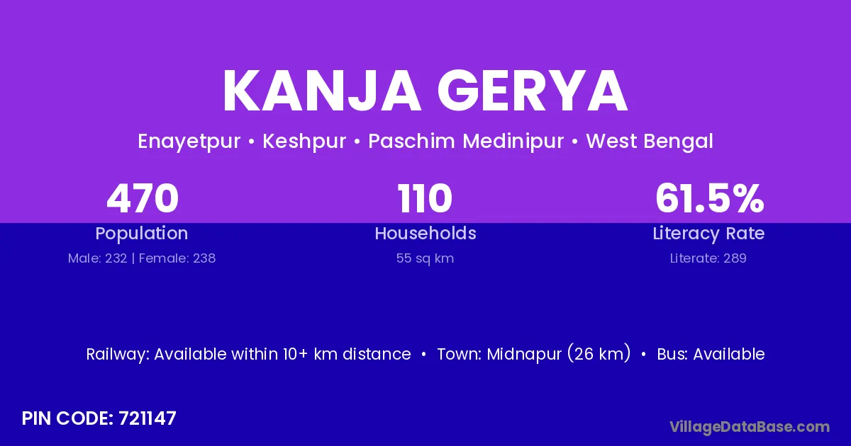 Midnapur (26 km) is the nearest town to Kanja Gerya village for major economic activities and is located approximately 26 km away.