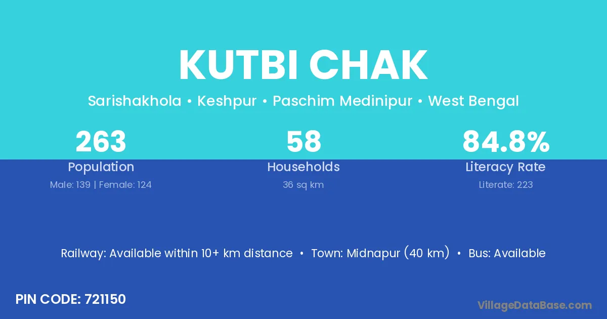 Midnapur (40 km) is the nearest town to Kutbi Chak village for major economic activities and is located approximately 40 km away.