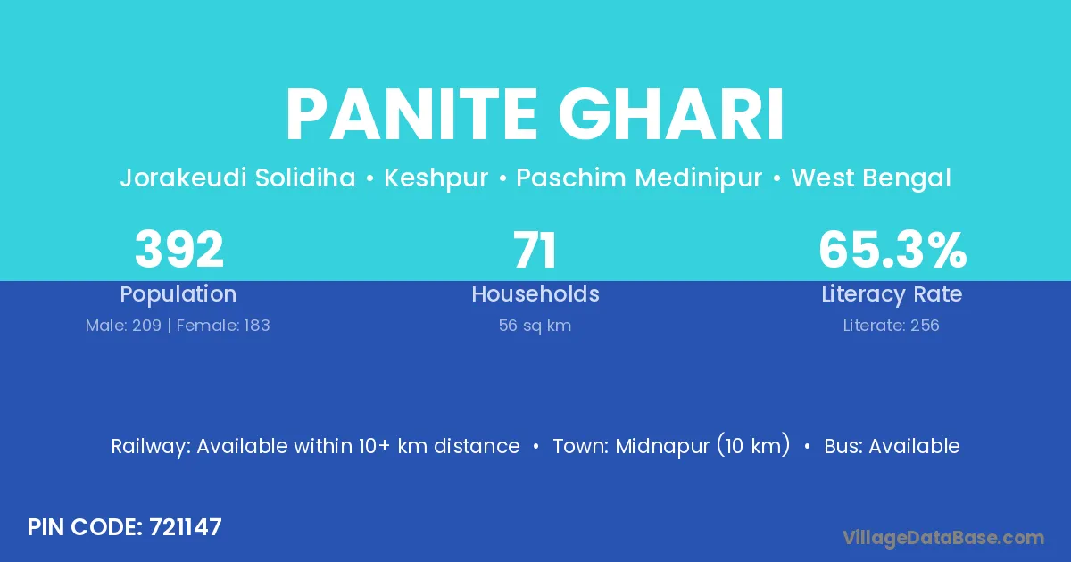 Midnapur (10 km) is the nearest town to Panite Ghari village for major economic activities and is located approximately 10 km away.