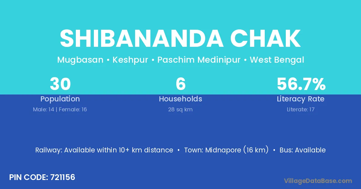 Midnapore (16 km) is the nearest town to Shibananda Chak village for major economic activities and is located approximately 16 km away.