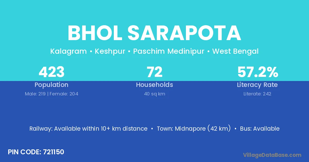 Midnapore (42 km) is the nearest town to Bhol Sarapota village for major economic activities and is located approximately 42 km away.