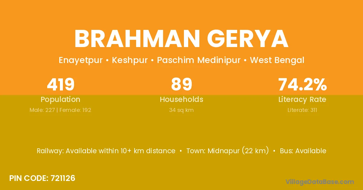 Midnapur (22 km) is the nearest town to Brahman Gerya village for major economic activities and is located approximately 22 km away.