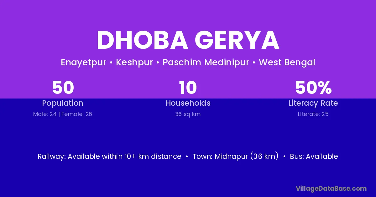 Midnapur (36 km) is the nearest town to Dhoba Gerya village for major economic activities and is located approximately 36 km away.