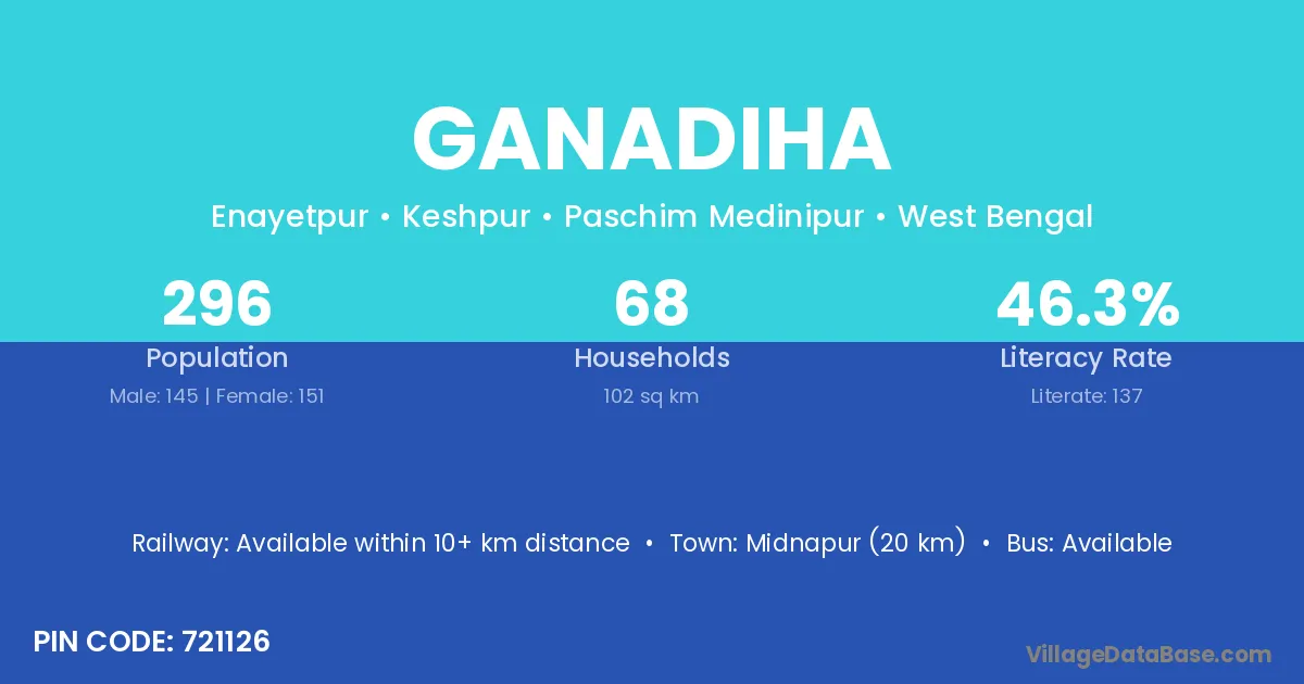 Midnapur (20 km) is the nearest town to Ganadiha village for major economic activities and is located approximately 20 km away.