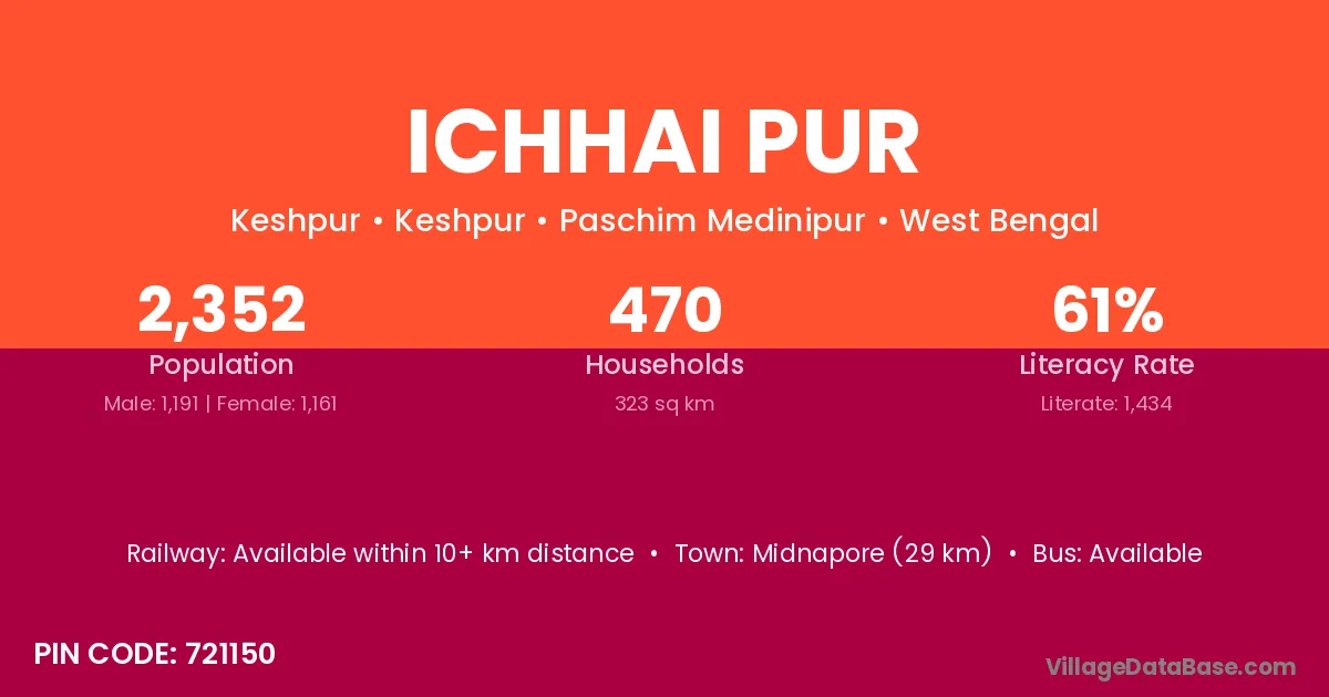 Midnapore (29 km) is the nearest town to Ichhai Pur village for major economic activities and is located approximately 29 km away.