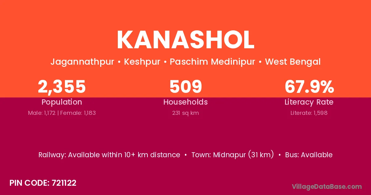 Midnapur (31 km) is the nearest town to Kanashol village for major economic activities and is located approximately 31 km away.