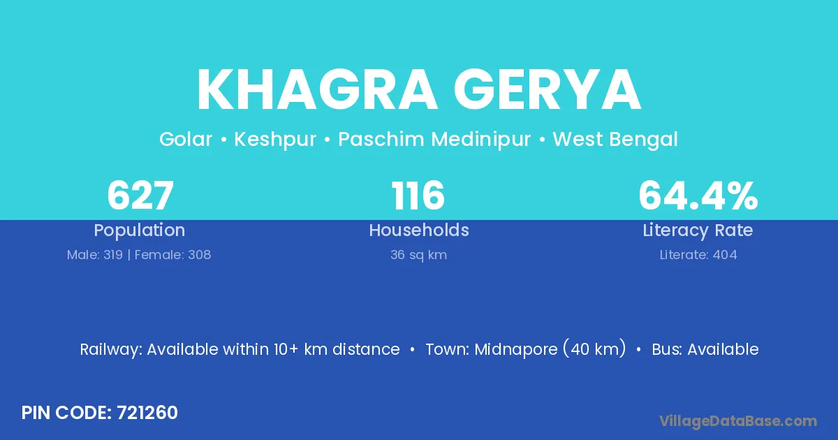 Midnapore (40 km) is the nearest town to Khagra Gerya village for major economic activities and is located approximately 40 km away.