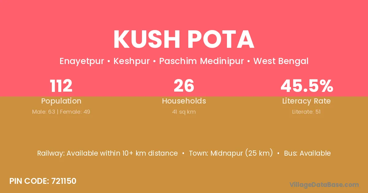 Midnapur (25 km) is the nearest town to Kush Pota village for major economic activities and is located approximately 25 km away.