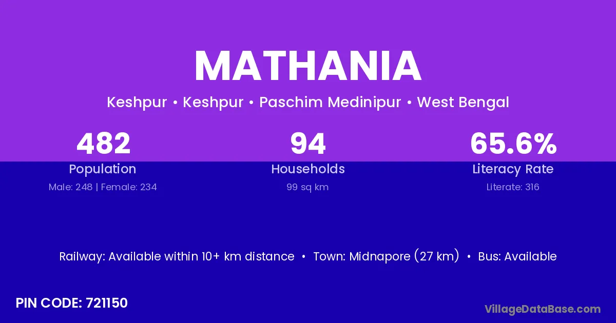 Midnapore (27 km) is the nearest town to Mathania village for major economic activities and is located approximately 27 km away.