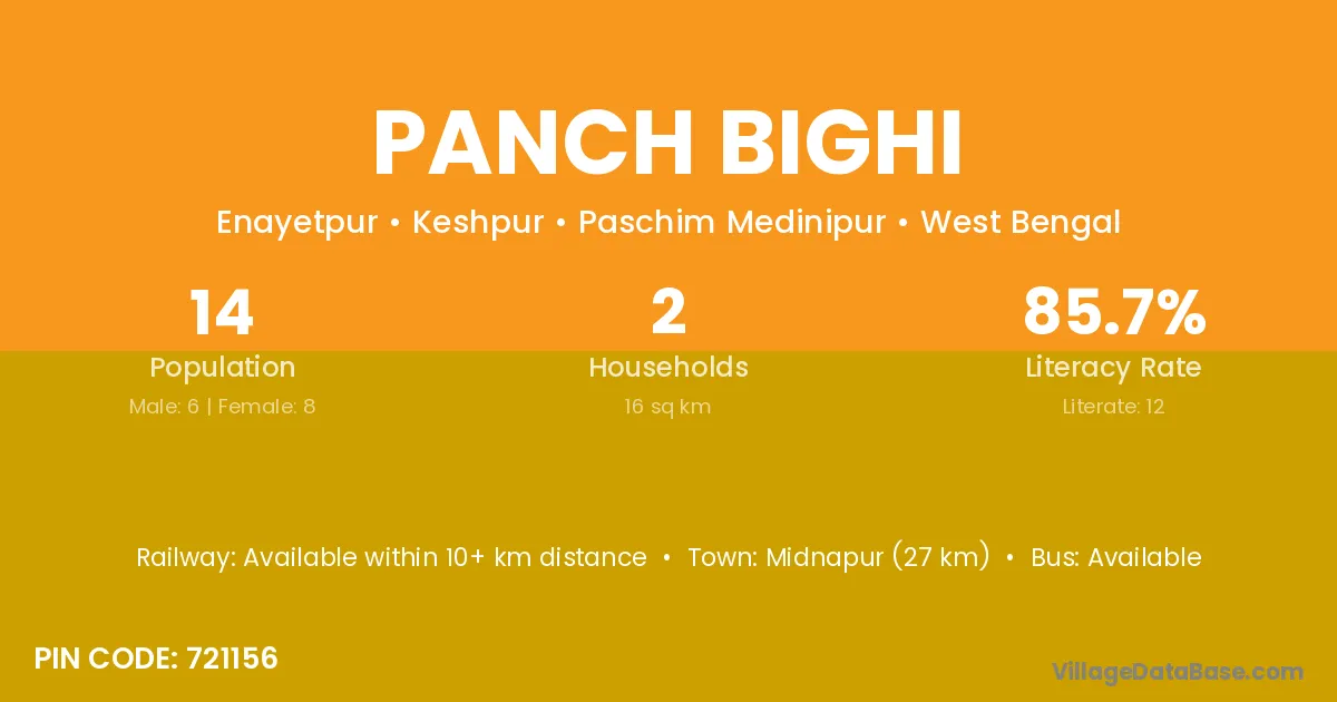 Midnapur (27 km) is the nearest town to Panch Bighi village for major economic activities and is located approximately 27 km away.