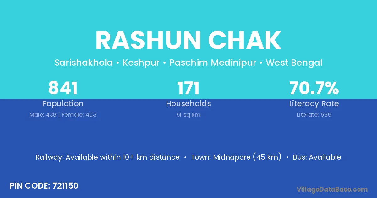 Midnapore (45 km) is the nearest town to Rashun Chak village for major economic activities and is located approximately 45 km away.