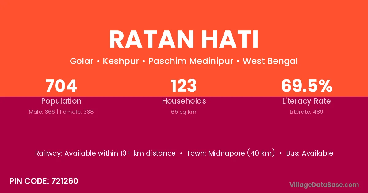 Midnapore (40 km) is the nearest town to Ratan Hati village for major economic activities and is located approximately 40 km away.