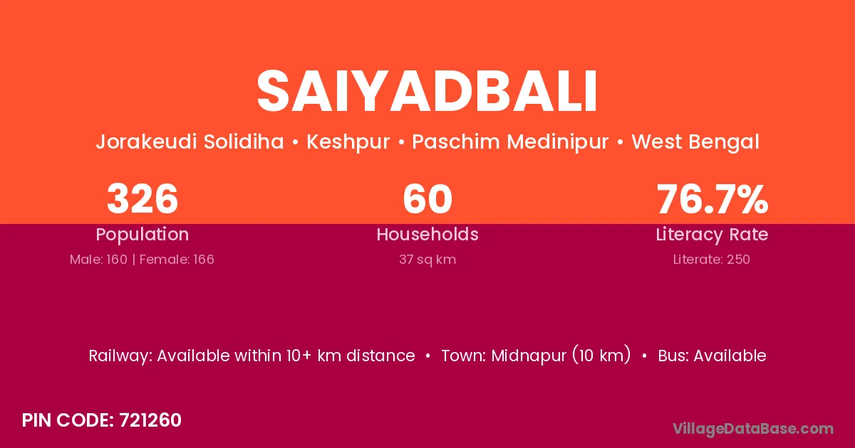 Midnapur (10 km) is the nearest town to Saiyadbali village for major economic activities and is located approximately 10 km away.