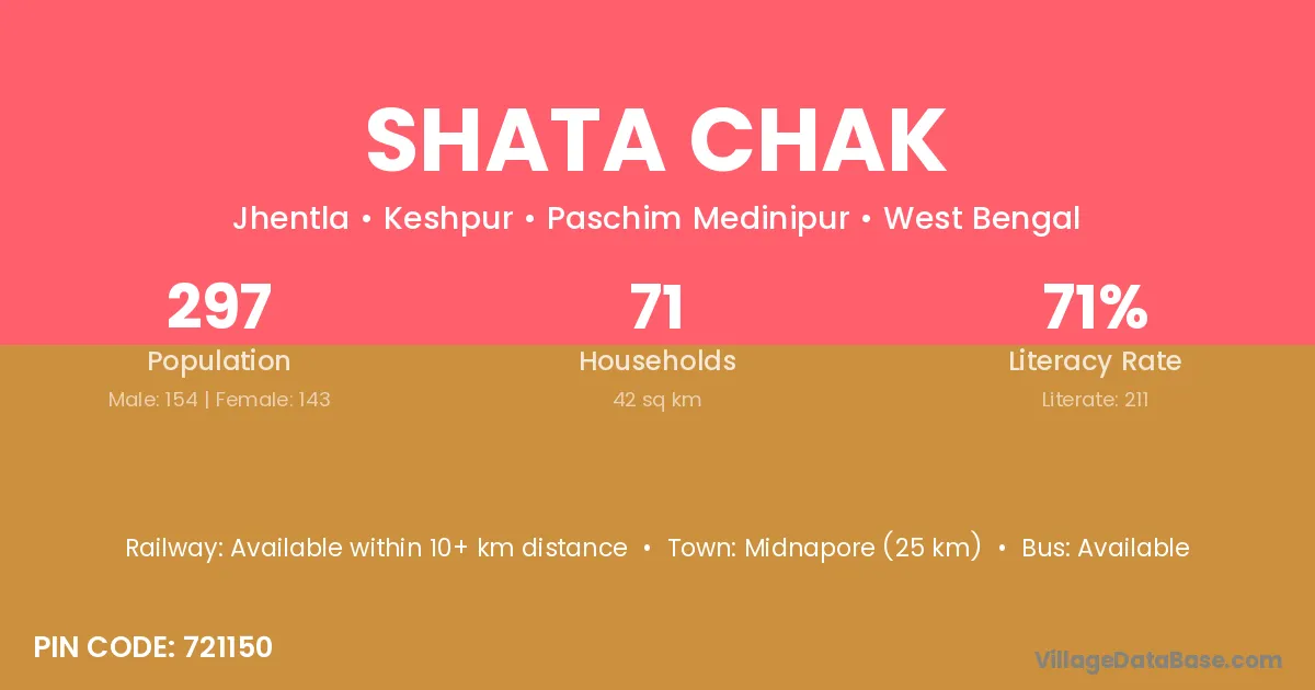 Midnapore (25 km) is the nearest town to Shata Chak village for major economic activities and is located approximately 25 km away.