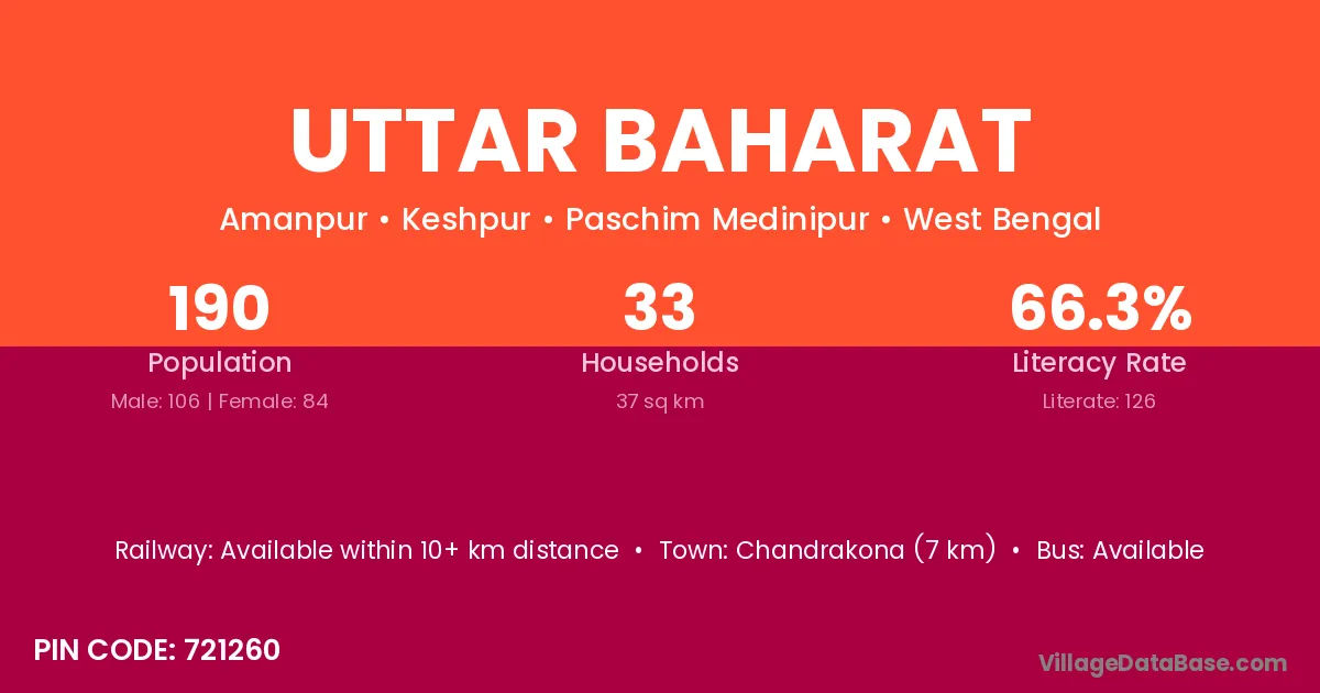 Chandrakona (7 km) is the nearest town to Uttar Baharat village for major economic activities and is located approximately 7 km away.