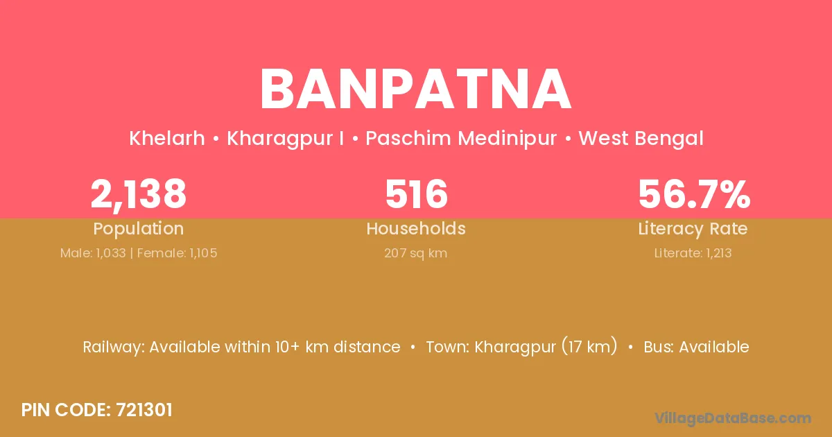 Kharagpur (17 km) is the nearest town to Banpatna village for major economic activities and is located approximately 17 km away.