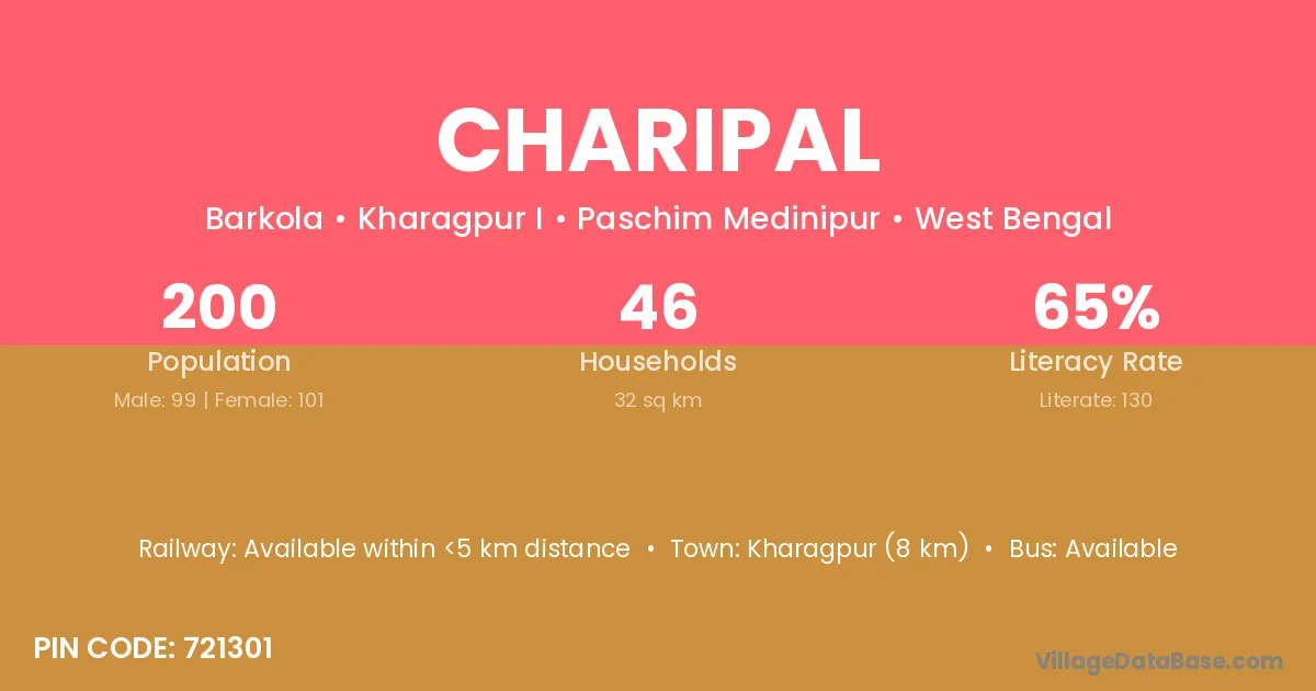Kharagpur (8 km) is the nearest town to Charipal village for major economic activities and is located approximately 8 km away.