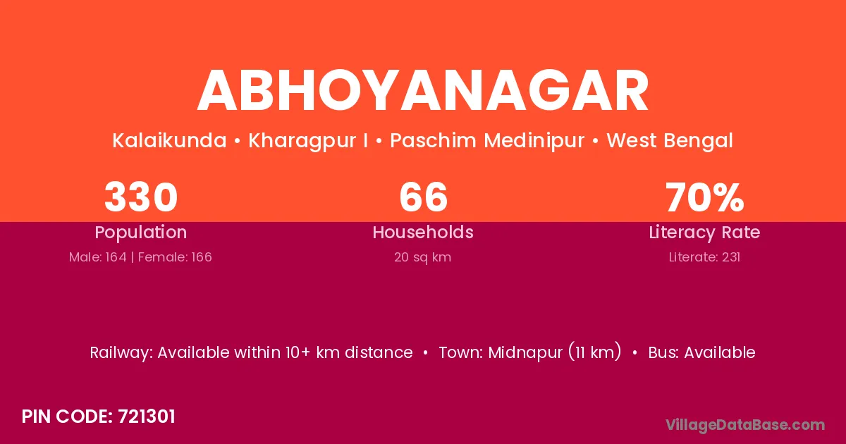 Midnapur (11 km) is the nearest town to Abhoyanagar village for major economic activities and is located approximately 11 km away.