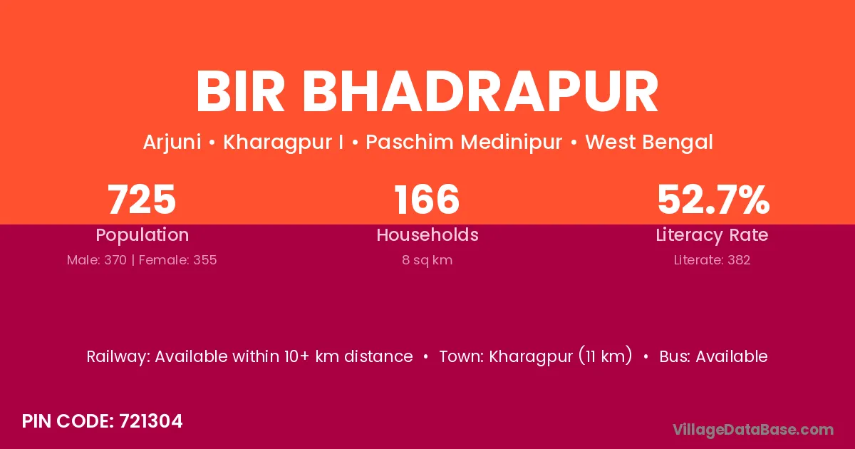 Kharagpur (11 km) is the nearest town to Bir Bhadrapur village for major economic activities and is located approximately 11 km away.