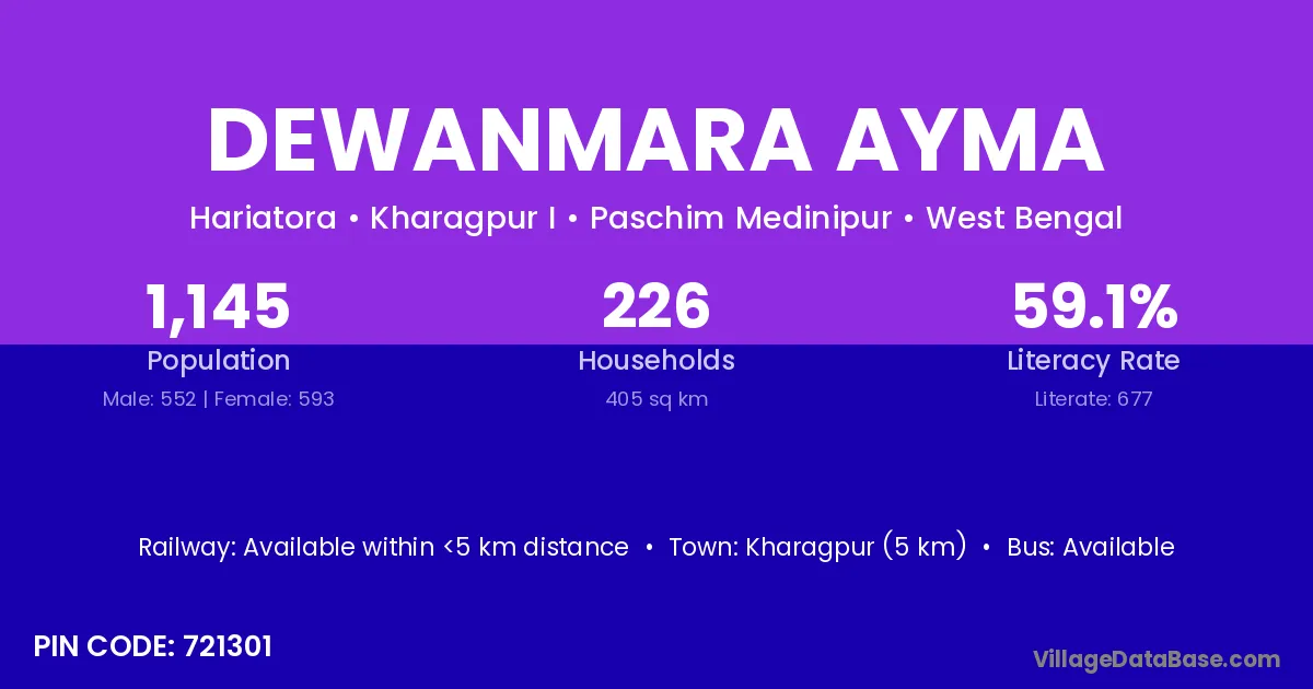 Kharagpur (5 km) is the nearest town to Dewanmara Ayma village for major economic activities and is located approximately 5 km away.