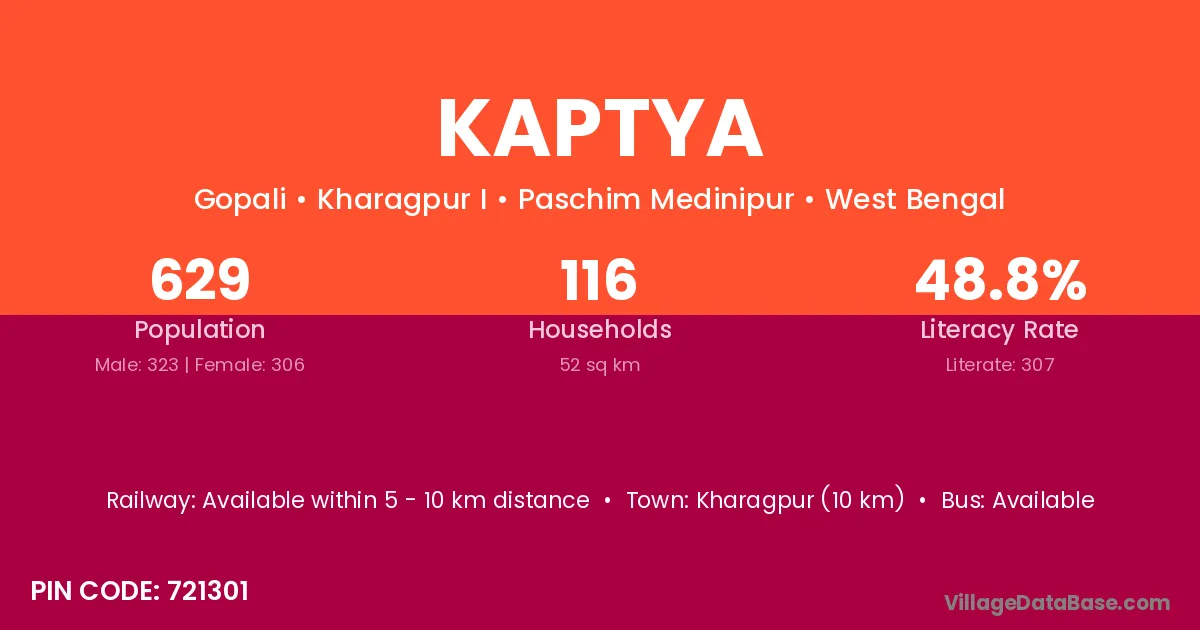 Kaptya village is located in the Kharagpur I Subdivision of the Paschim Medinipur district in West Bengal.