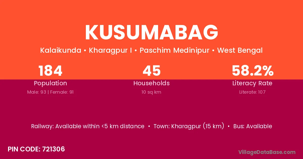 Kharagpur (15 km) is the nearest town to Kusumabag village for major economic activities and is located approximately 15 km away.