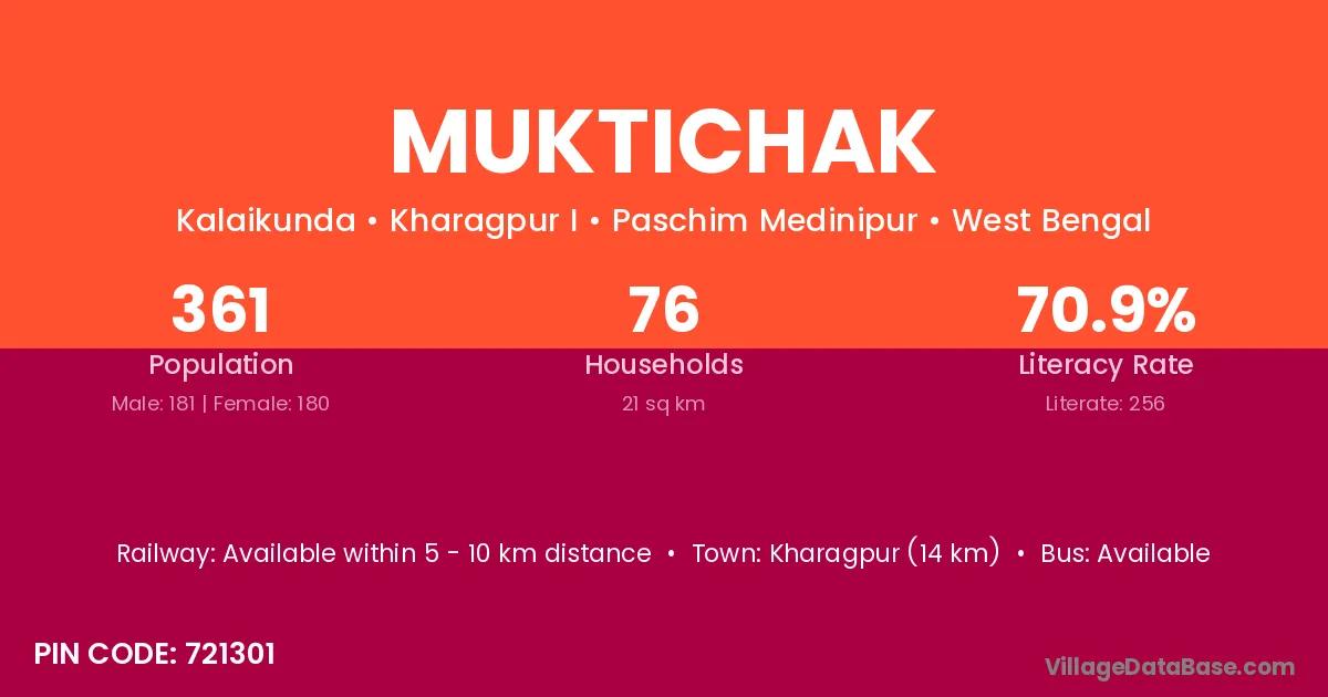 Kharagpur (14 km) is the nearest town to Muktichak village for major economic activities and is located approximately 14 km away.