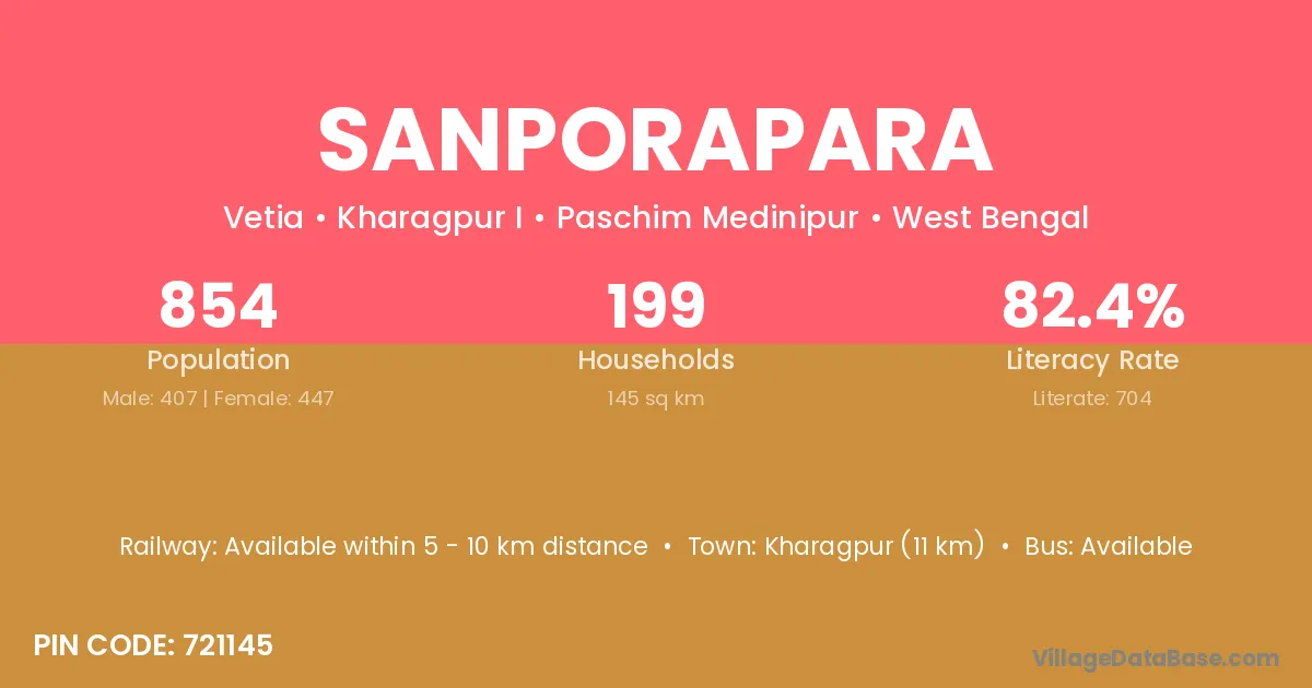 Kharagpur (11 km) is the nearest town to Sanporapara village for major economic activities and is located approximately 11 km away.