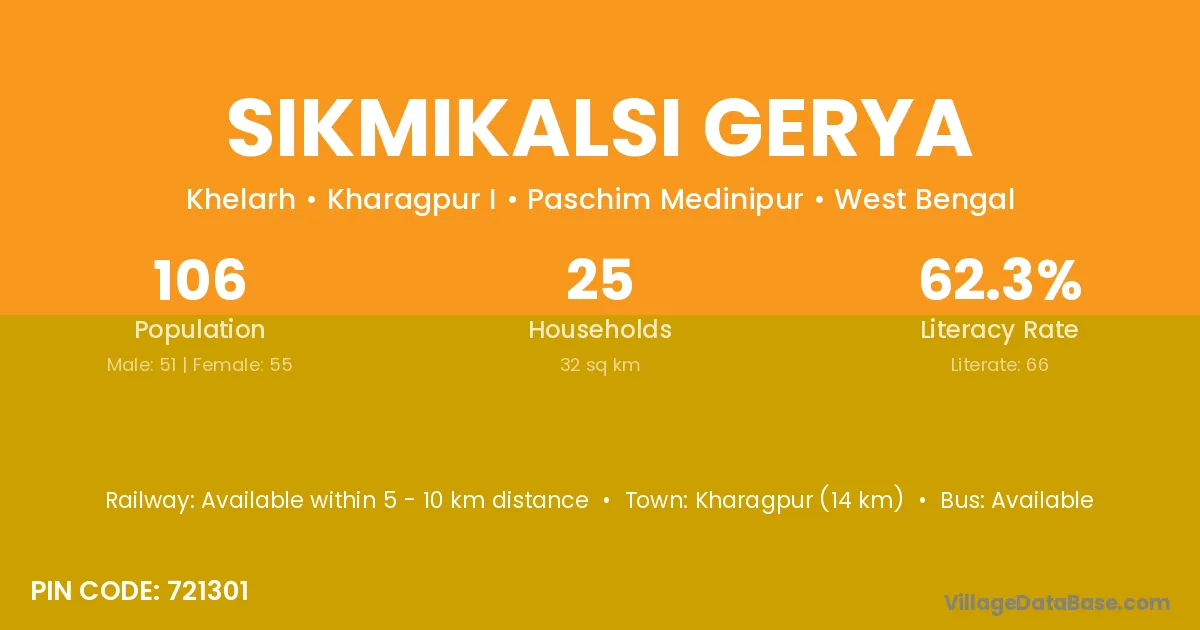 Kharagpur (14 km) is the nearest town to Sikmikalsi Gerya village for major economic activities and is located approximately 14 km away.