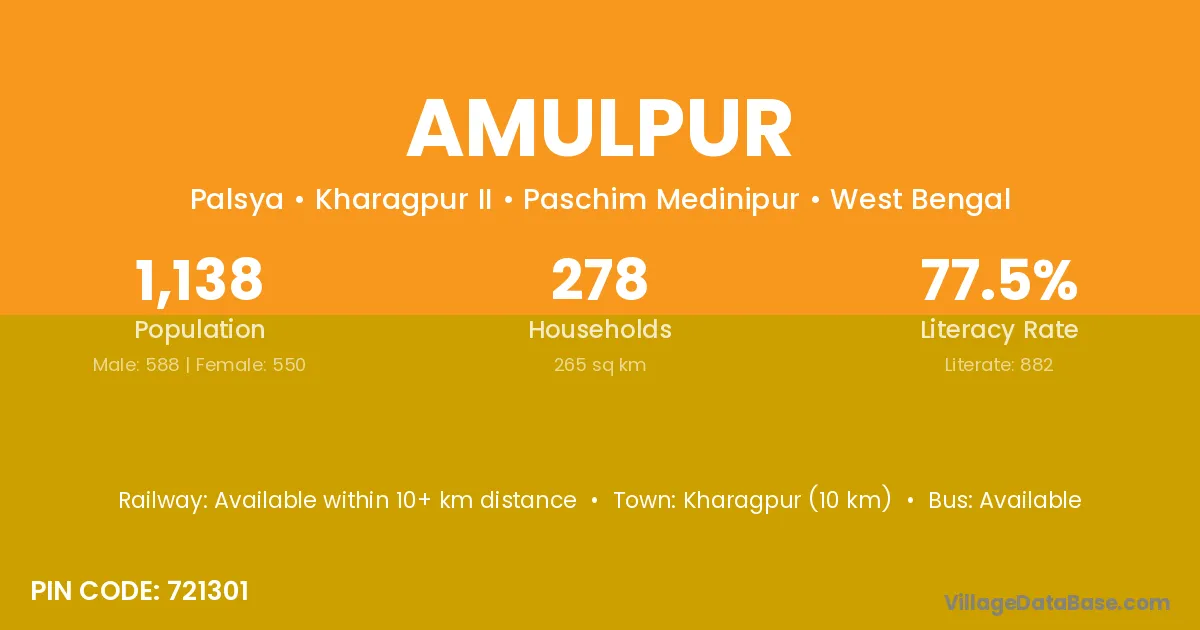 Kharagpur (10 km) is the nearest town to Amulpur village for major economic activities and is located approximately 10 km away.