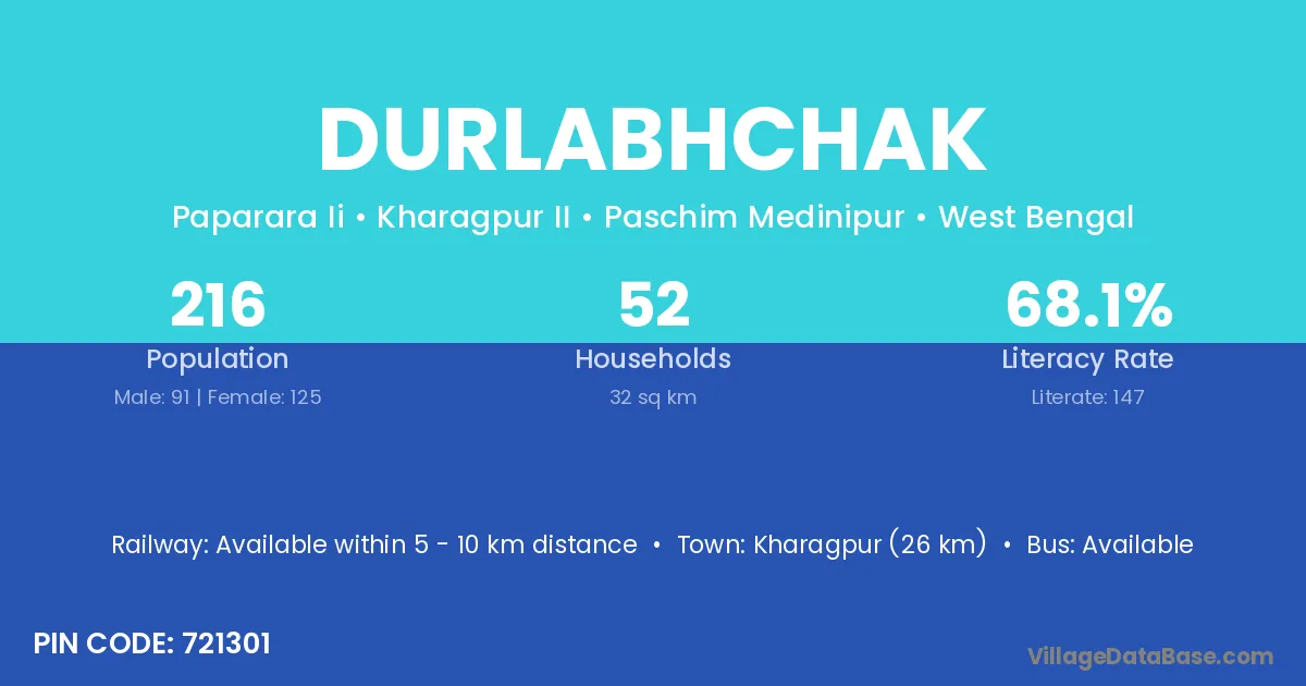 Kharagpur (26 km) is the nearest town to Durlabhchak village for major economic activities and is located approximately 26 km away.