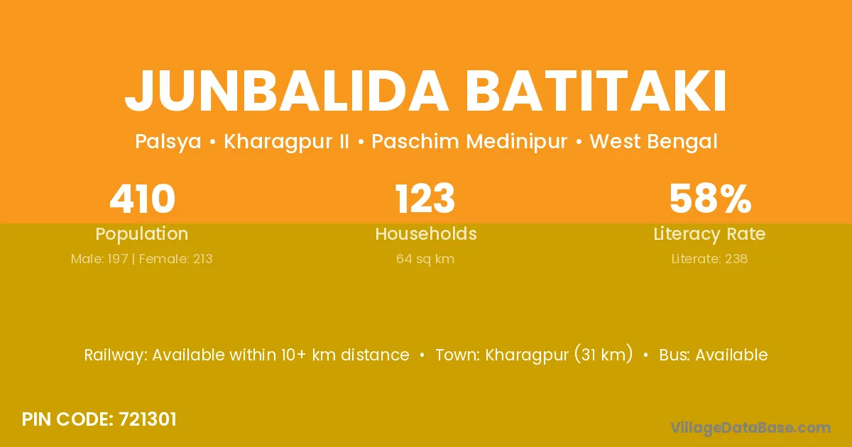 Kharagpur (31 km) is the nearest town to Junbalida Batitaki village for major economic activities and is located approximately 31 km away.