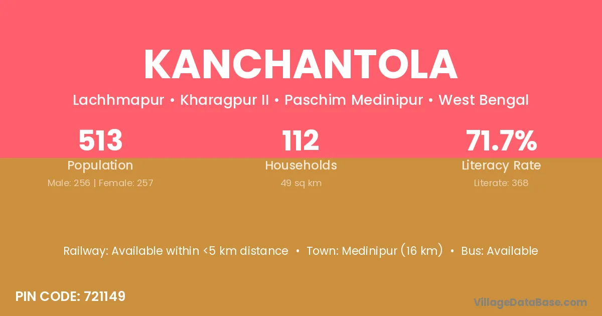 Medinipur (16 km) is the nearest town to Kanchantola village for major economic activities and is located approximately 16 km away.