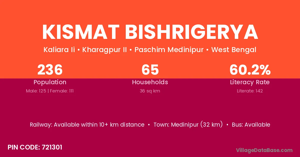 Medinipur (32 km) is the nearest town to Kismat Bishrigerya village for major economic activities and is located approximately 32 km away.