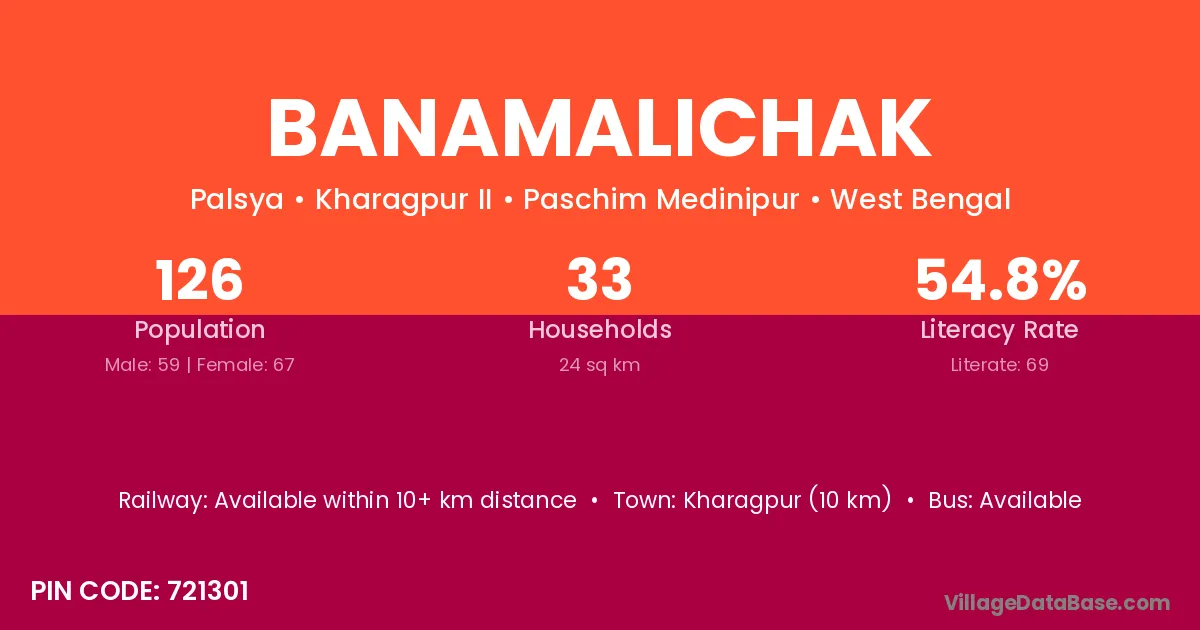 Kharagpur (10 km) is the nearest town to Banamalichak village for major economic activities and is located approximately 10 km away.