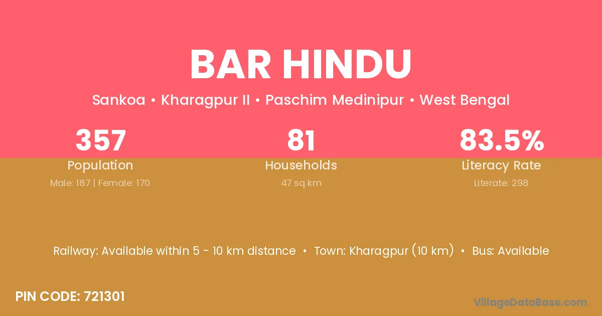Kharagpur (10 km) is the nearest town to Bar Hindu village for major economic activities and is located approximately 10 km away.