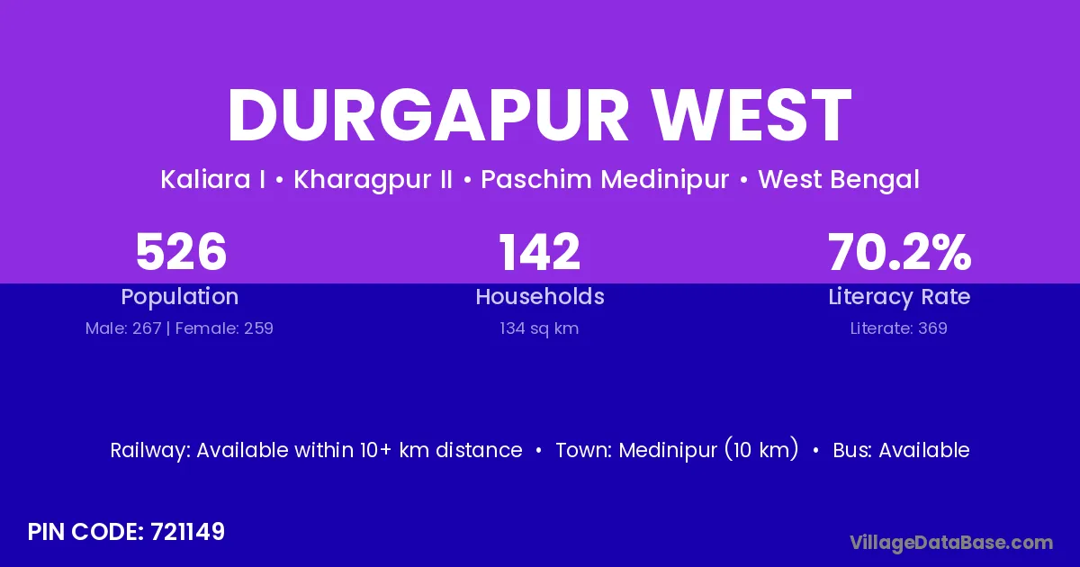 Medinipur (10 km) is the nearest town to Durgapur West village for major economic activities and is located approximately 10 km away.