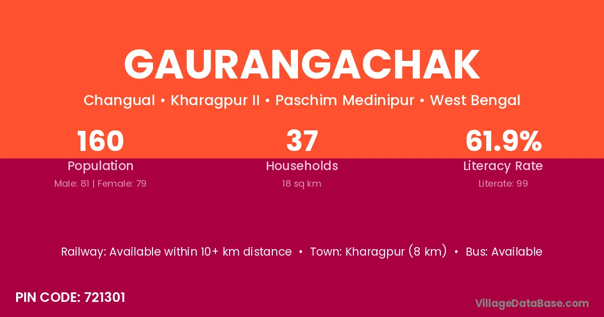 Kharagpur (8 km) is the nearest town to Gaurangachak village for major economic activities and is located approximately 8 km away.