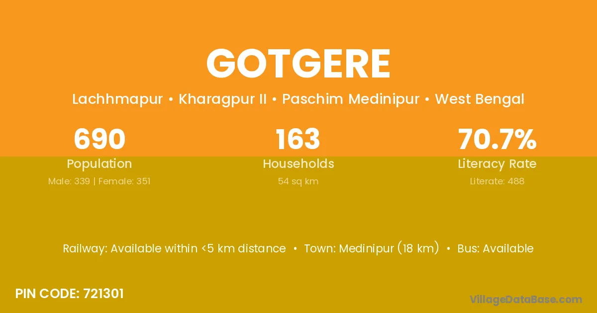 Medinipur (18 km) is the nearest town to Gotgere village for major economic activities and is located approximately 18 km away.