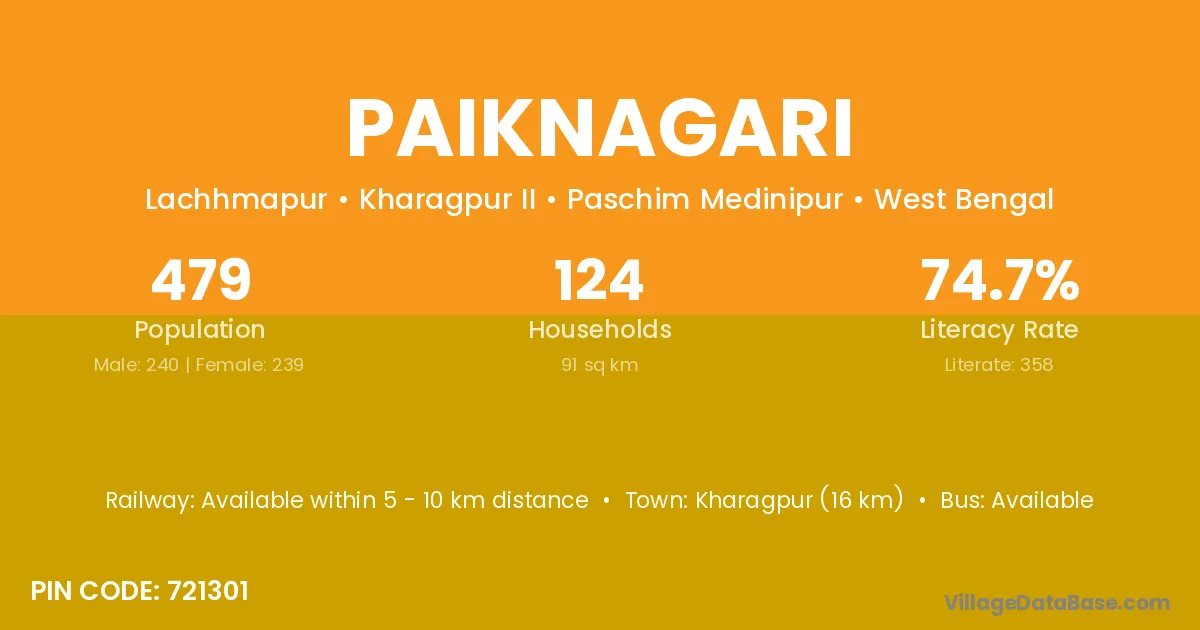 Kharagpur (16 km) is the nearest town to Paiknagari village for major economic activities and is located approximately 16 km away.