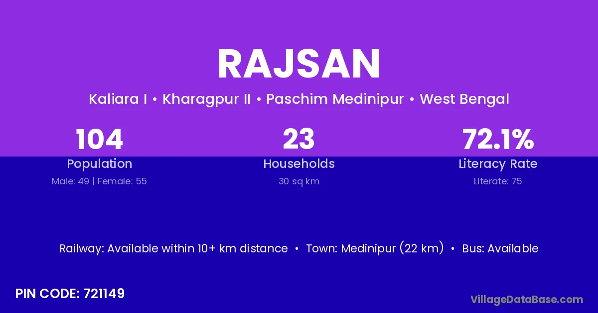 Medinipur (22 km) is the nearest town to Rajsan village for major economic activities and is located approximately 22 km away.