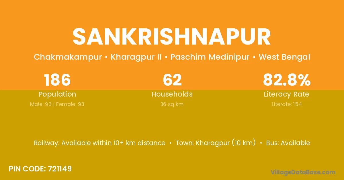 Kharagpur (10 km) is the nearest town to Sankrishnapur village for major economic activities and is located approximately 10 km away.