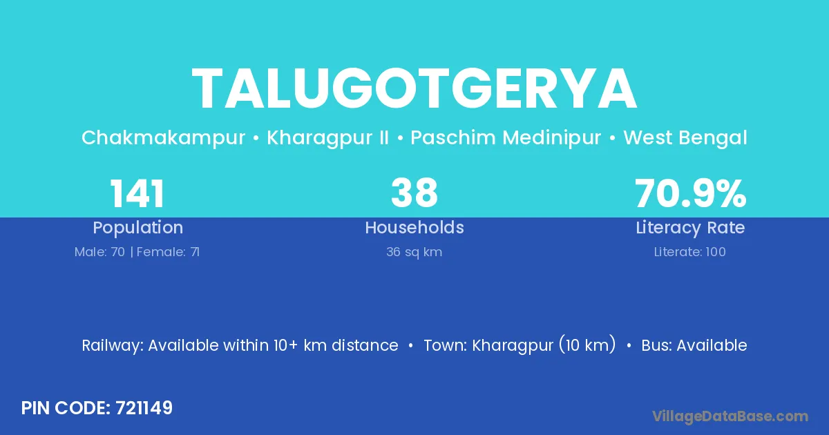 Kharagpur (10 km) is the nearest town to Talugotgerya village for major economic activities and is located approximately 10 km away.